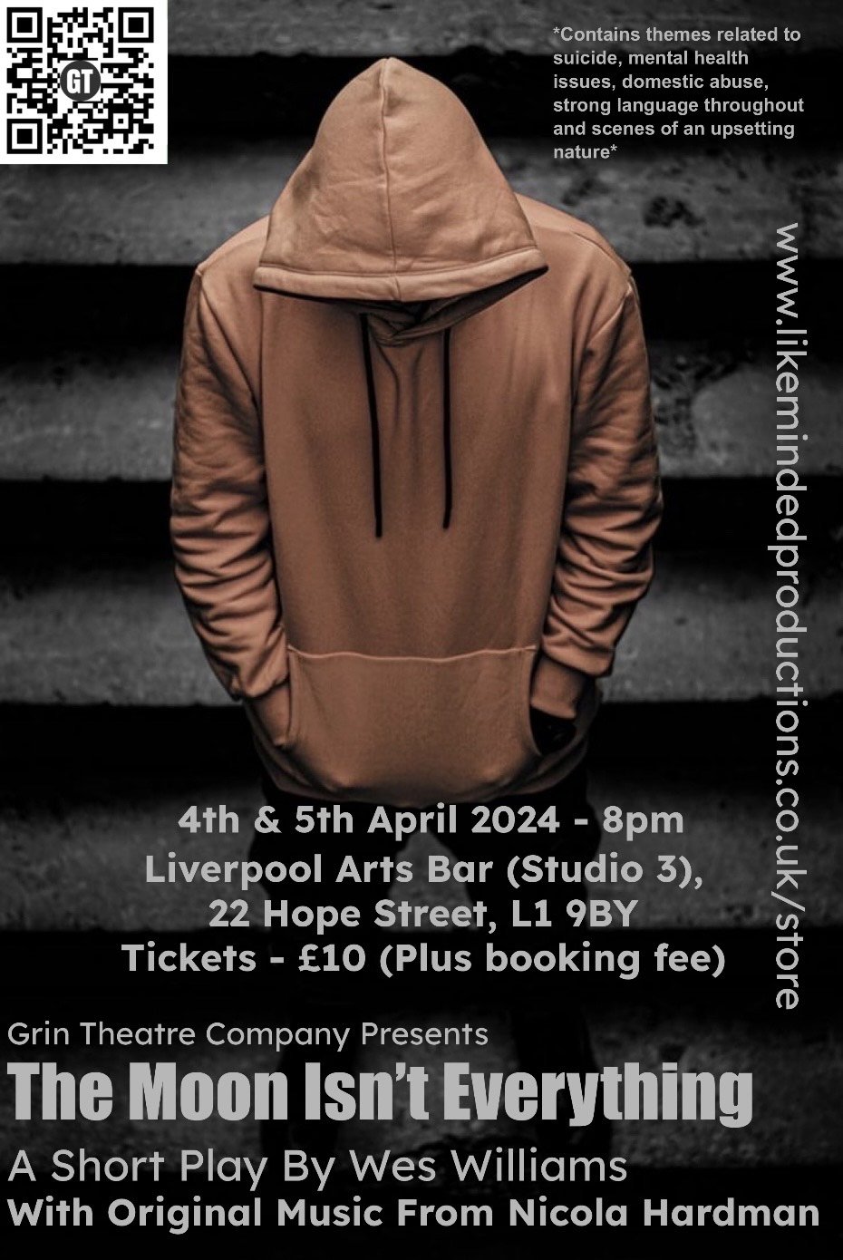 Working on Grin Theatre’s new play The Moon Isn’t Everything has been an incredibly moving and poignant time for me as the writer and director of this piece. This short play hopefully packs an incredible punch in its betrayal of mental health, the value of just listening to someone and the abuse that one person can inflict upon another. It’s not an easy play but then it’s not an easy subject. As a writer I spent months documenting real life sources to make the play as realistic and as valuable as possible and it truly has been a labour of love from conception to rehearsal to eventual performance over two nights at Studio 3 at Hope Street.